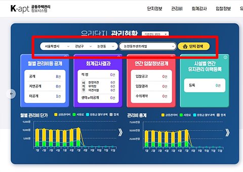 K-apt 공동주택관리 정보시스템에서는 전국의 아파트관리비에 대해 알아볼 수 있습니다. 전국 약 13만 개 동, 1100만 호의 관리비를 조회할 수 있습니다.