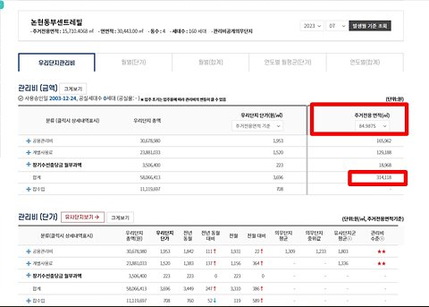 조회결과화면에서 우측에 주거전용 면적에 따라 차등적으로 관리비를 검색하실 수 있습니다. 전용면적으로 검색합니다. 시스템에 등록되는 기간이 있으므로 2~3개월 전 관리비를 조회할 수 있습니다. 단지별로 관리여건을 고려하여 관리규약에서 지분의 비율과 부담액을 다르게 산정하고 있는 경우 실제 부과되고 있는 금액과 다소 차이가 있을 수 있습니다.