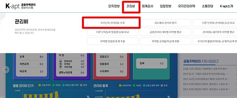 단지를 검색한 후 메인화면의 위쪽에 관리비란에 마우스를 올리고 우리 단지 관리비등 조회를 눌러줍니다.